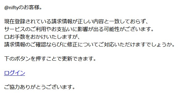 今回は”nifty”を騙る詐欺メールです。