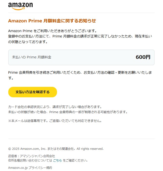 『登録中のお支払い方法にて、Prime 月額料金の請求が正常に完了しなかったため、現在未払いの状態となっております。』