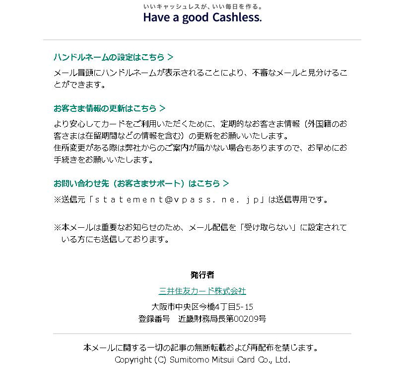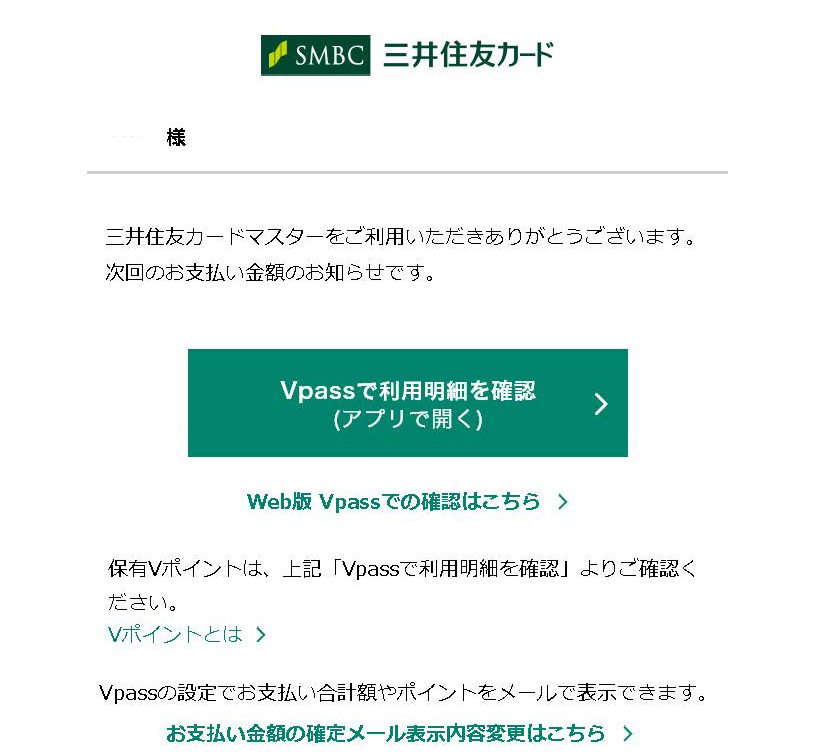 「三井住友カードマスターをご利用いただきありがとうございます。次回のお支払い金額のお知らせです。」