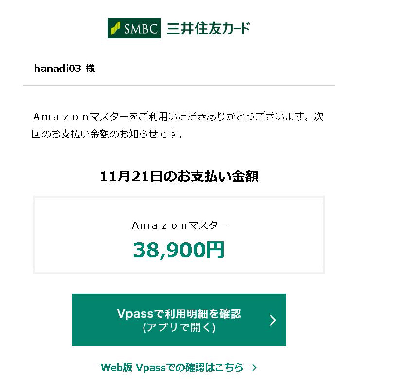 「Amazonマスターをご利用いただきありがとうございます。次回のお支払い金額のお知らせです。」