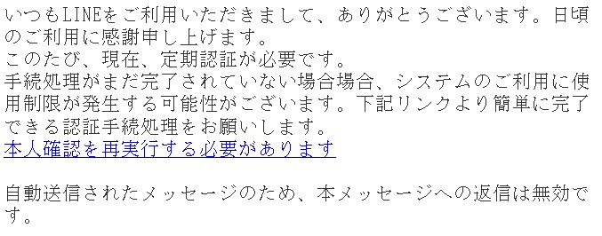 「手続処理がまだ完了されていない場合場合、システムのご利用に使用制限が発生する可能性がございます。下記リンクより 簡単に完了できる認証手続処理をお願いします。。」