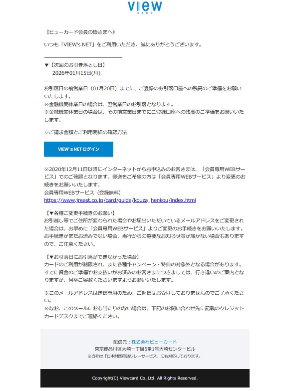 ご確認:VIEW’s NETお引落日です