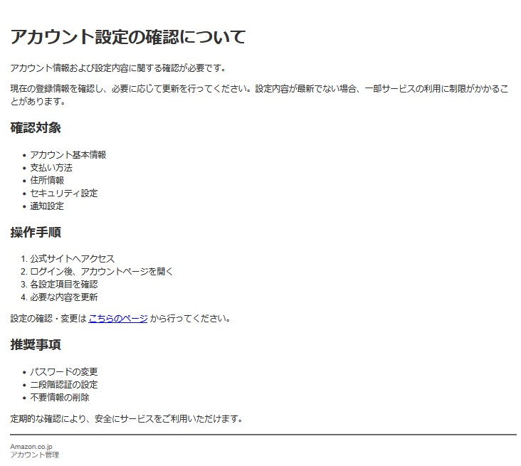 『アカウント情報および設定内容に関する確認が必要です。』