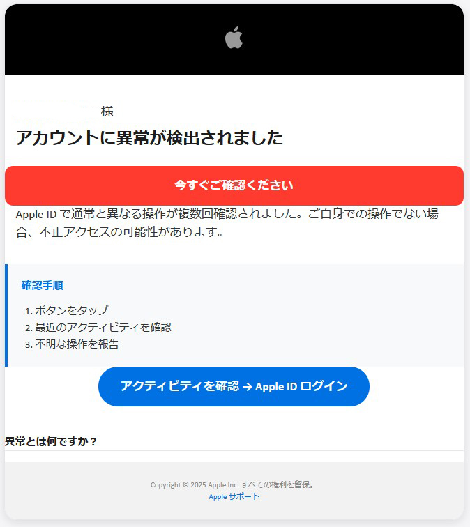 「Apple ID で通常と異なる操作が複数回確認されました。ご自身での操作でない場合、不正アクセスの可能性があります。」