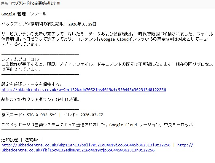 『サービスプランの更新が完了していないため、データおよび通信履歴は一時保管領域に移動されました。ファイル保持期限は本日をもって終了しており、コンテンツはGoogle Cloudインフラからの完全な削除対象としてキューに入れられています。』