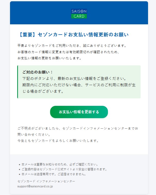 『お客様のカード情報に変更または有効期限切れが確認されたため、お支払い情報の更新をお願いいたします。』