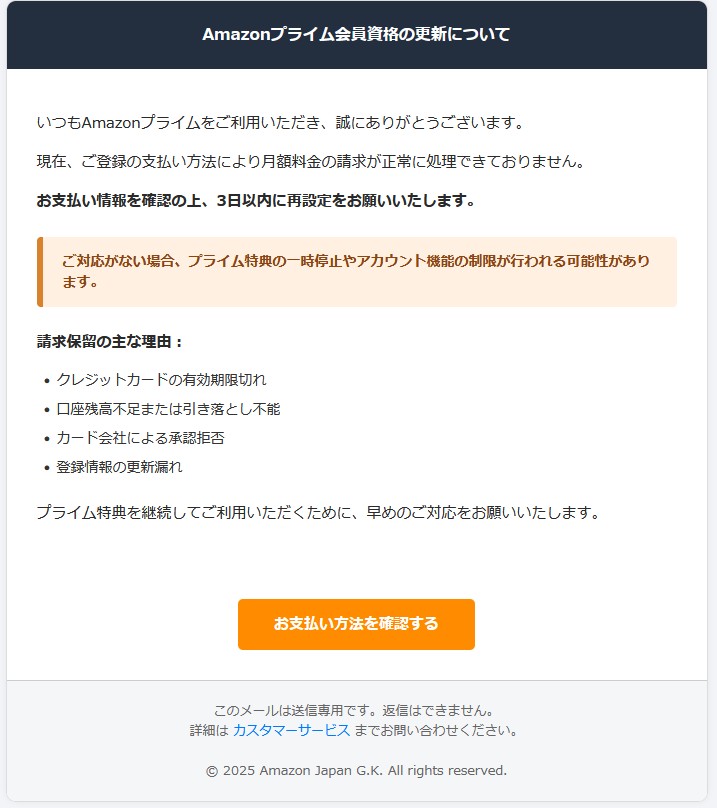 「お支払い情報を確認の上、3日以内に再設定をお願いいたします。」
