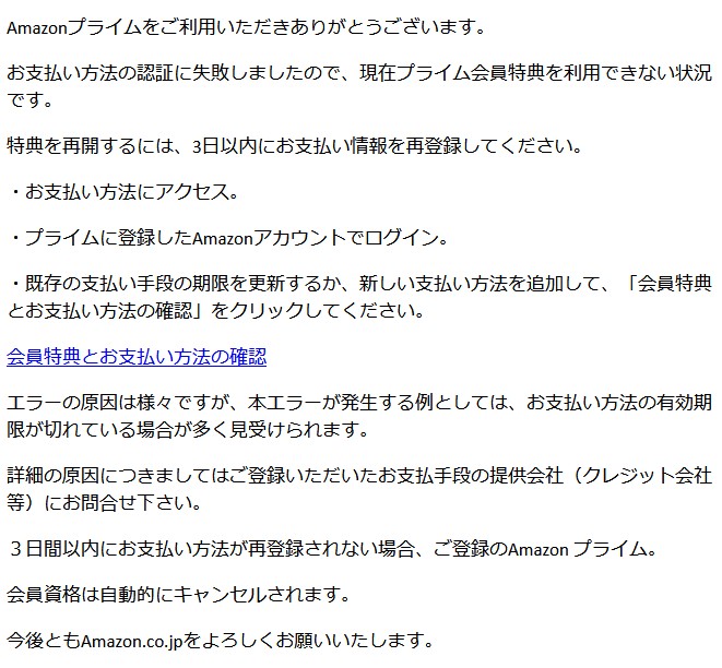 『お支払い方法の認証に失敗しましたので、現在プライム会員特典を利用できない状況です。』