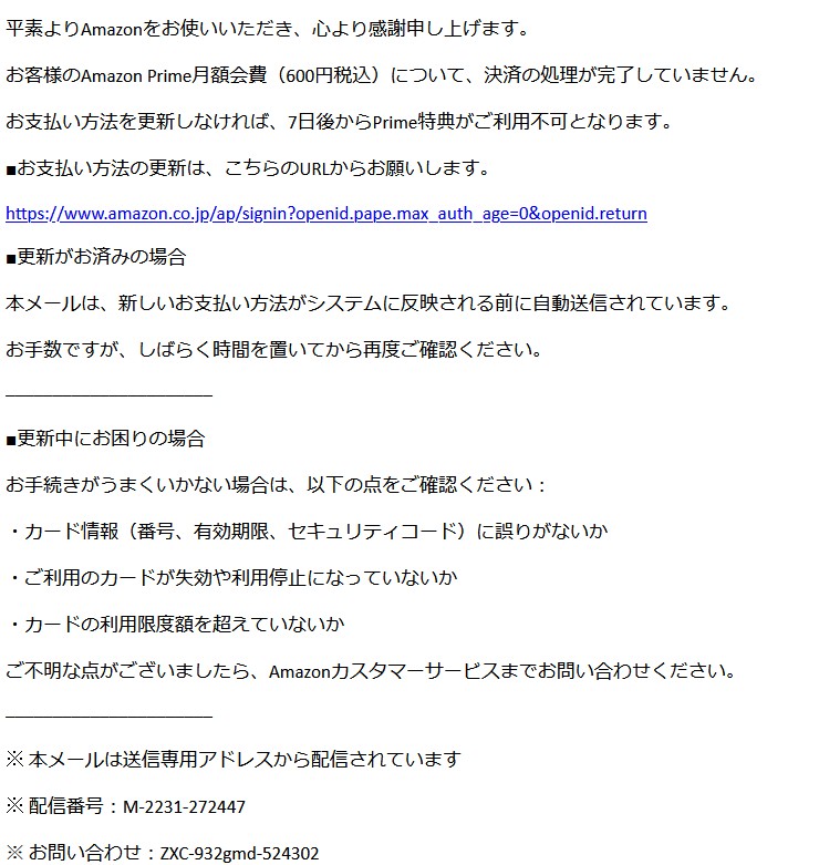 『お客様のAmazon Prime月額会費(600円税込)について、決済の処理が完了していません。』