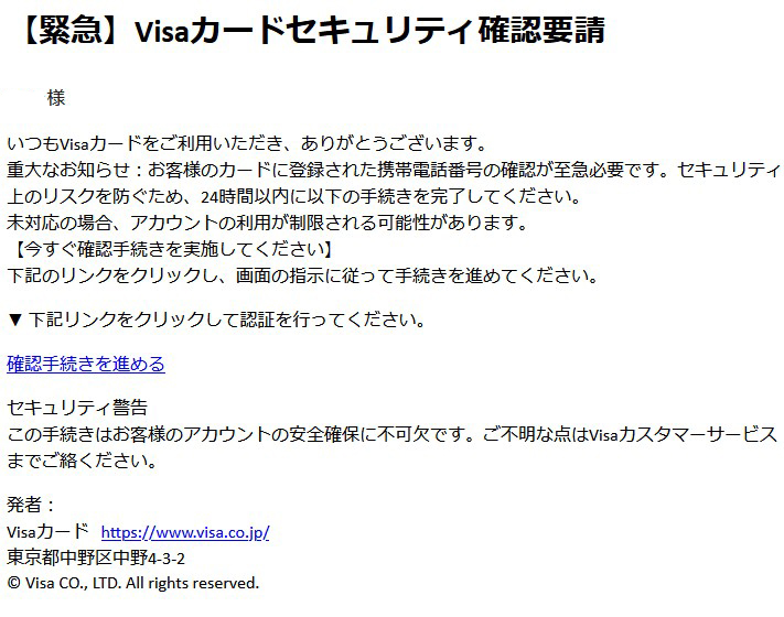 重大なお知らせ:お客様のカードに登録された携帯電話番号の確認が至急必要です。セキュリティ上のリスクを防ぐため、24時間以内に以下の手続きを完了してください。』