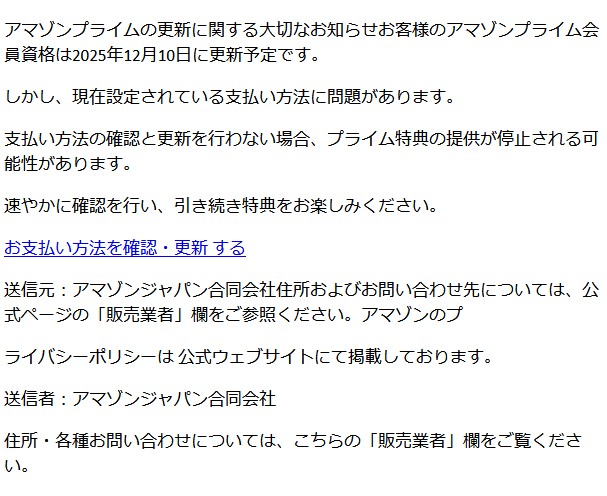 『アマゾンプライムの更新に関する大切なお知らせ お客様のアマゾンプライム会員資格は2025年12月10日に更新予定です。