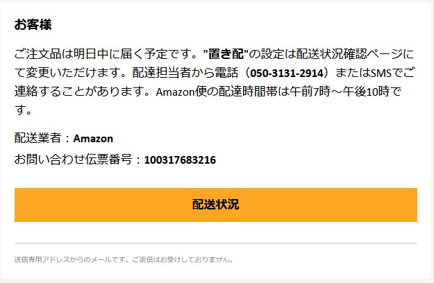 ご注文品は明日中に届く予定です。“置き配”の設定は配送状況確認ページにて変更いただけます。