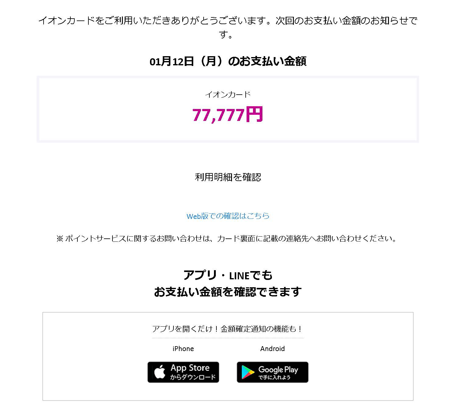 『01月12日(月)のお支払い金額 イオンカード 77,777円』