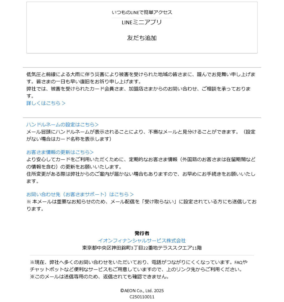 今回は”イオンカード”を騙る詐欺メールです。