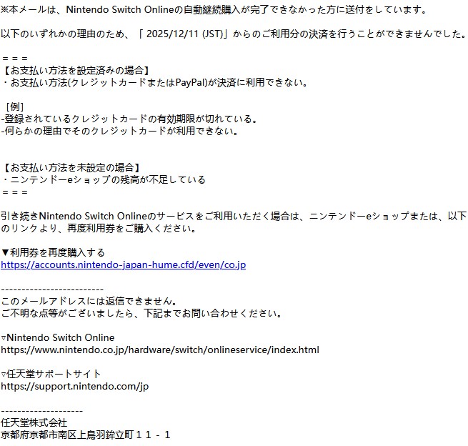 『※本メールは、Nintendo Switch Onlineの自動継続購入が完了できなかった方に送付をしております。』