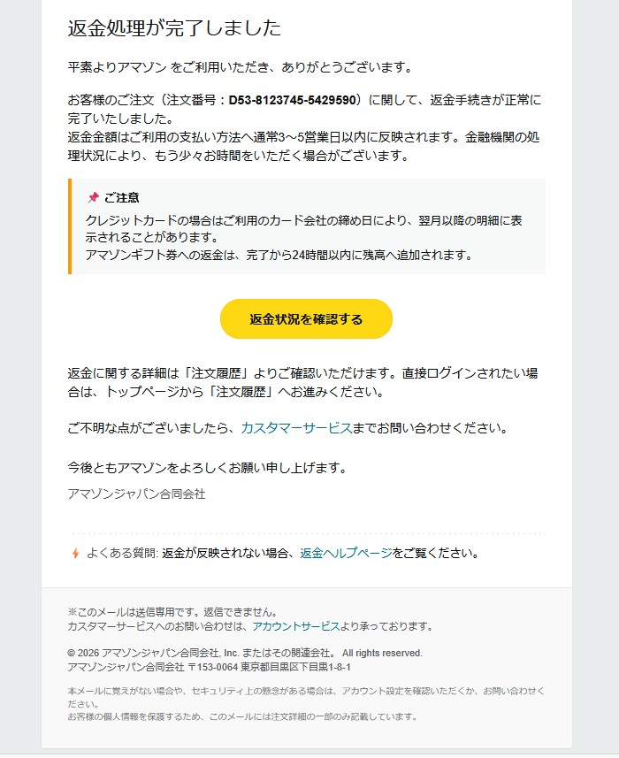 『お客様のご注文(注文番号:D53-8123745-5429590)に関して、返金手続きが正常に完了いたしました。』