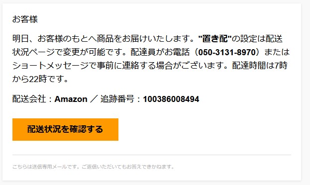 『明日、お客様のもとへ商品をお届けいたします。“置き配”の設定は配送状況ページで変更が可能です。』