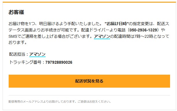 『配達ドライバーより電話(050-2936-1329)やSMSでご連絡を差し上げる場合がございます。アマゾンの配達時間は7時~22時となっております。』