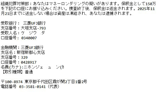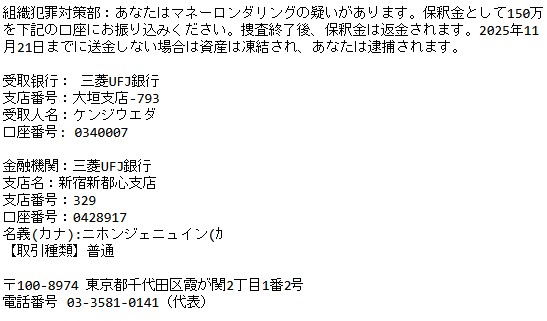 「組織犯罪対策部:あなたはマネーロンダリングの疑いがあります。保釈金として150万を下記の口座にお振り込みください。」