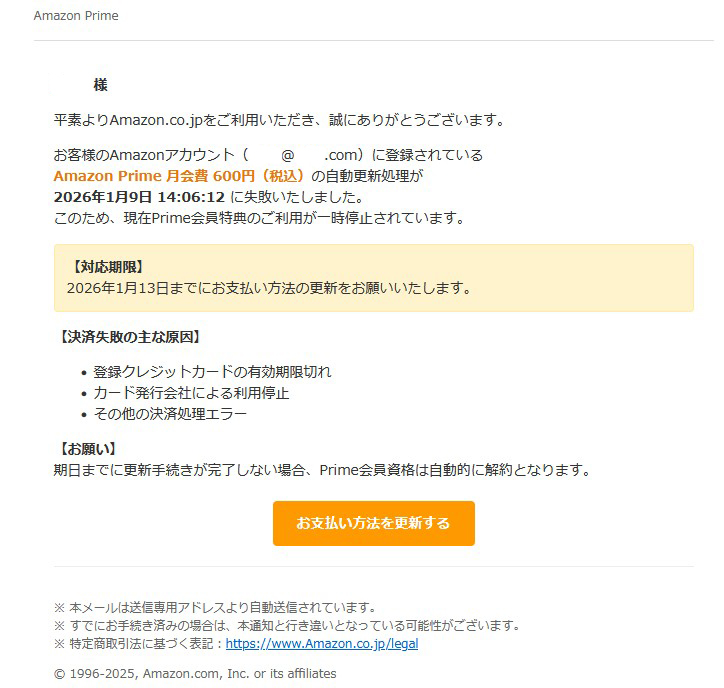 『お客様のAmazonアカウント(◆◆◆@〇〇〇.com)に登録されているAmazon Prime 月会費 600円(税込)の自動更新処理が2026年1月6日 14:06:12 に失敗いたしました。』