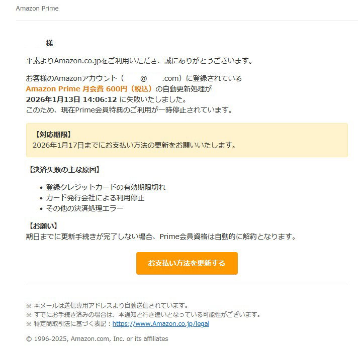 『お客様のAmazonアカウント(◆◆◆@〇〇〇.com)に登録されているAmazon Prime 月会費 600円(税込)の自動更新処理が2026年1月13日 14:06:12 に失敗いたしました。』