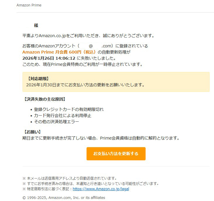 『お客様のAmazonアカウント(◆◆◆@〇〇〇.com)に登録されているAmazon Prime 月会費 600円(税込)の自動更新処理が2026年1月26日 14:06:12 に失敗いたしました。』