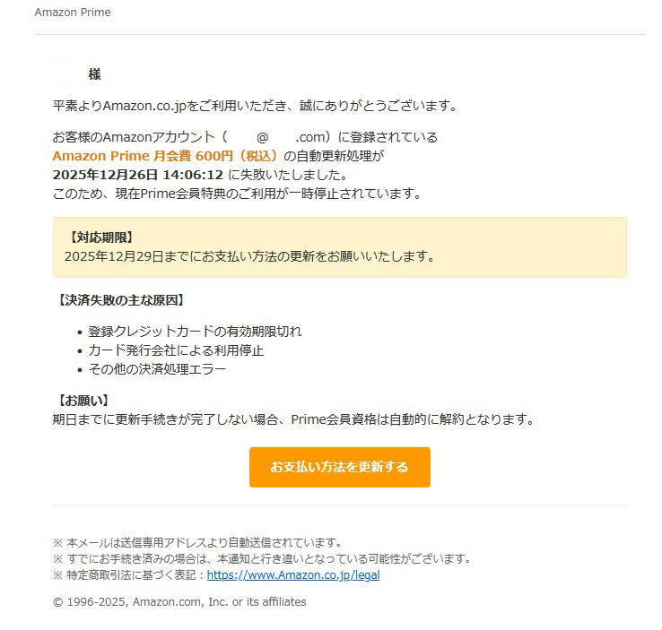 『お客様のAmazonアカウント(◆◆◆@〇〇〇.com)に登録されているAmazon Prime 月会費 600円(税込)の自動更新処理が2025年12月26日 14:06:12 に失敗いたしました。。』