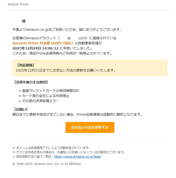 『お客様のAmazonアカウント(◆◆◆@〇〇〇.com)に登録されているAmazon Prime 月会費 600円(税込)の自動更新処理が2025年12月29日 14:06:12 に失敗いたしました。』
