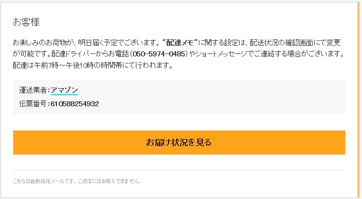 『お楽しみのお荷物が、明日届く予定でございます。 “配達メモ”に関する設定は、配送状況の確認画面にて変更が可能です。』