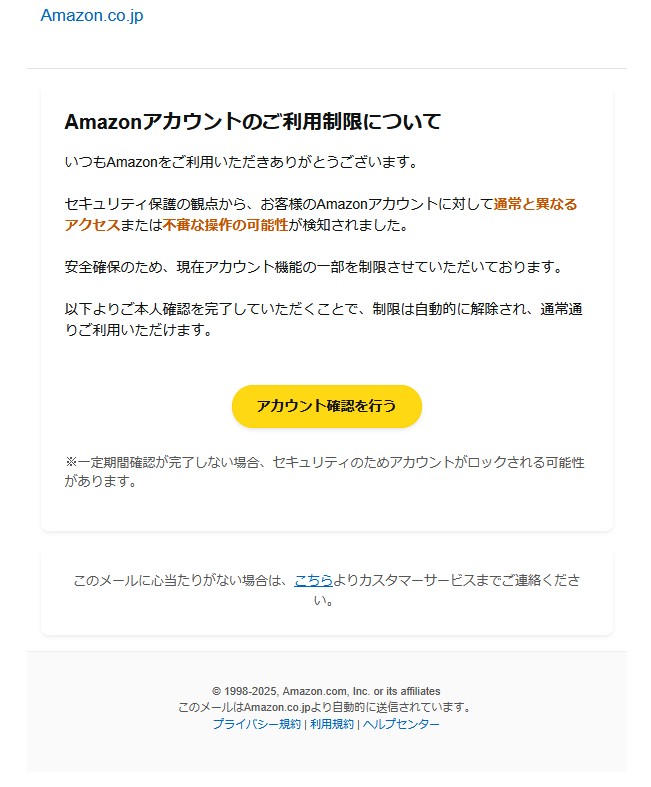 『セキュリティ保護の観点から、お客様のAmazonアカウントに対して通常と異なるアクセスまたは不審な操作の可能性が検知されました。』