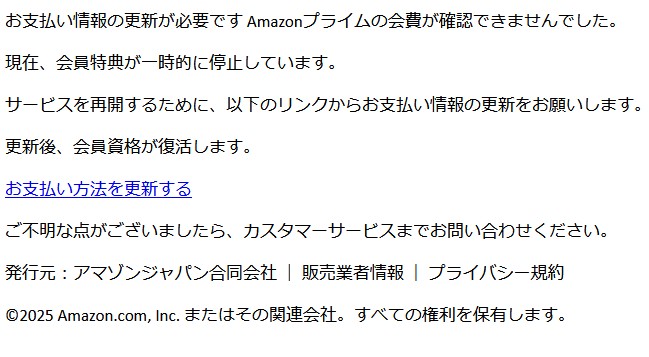 『お支払い情報の更新が必要です Amazonプライムの会費が確認できませんでした。