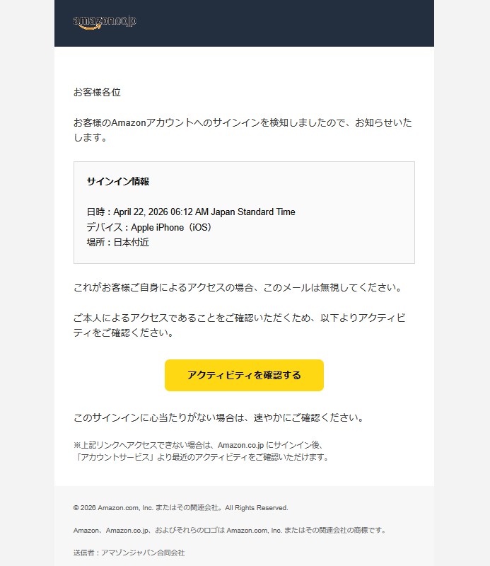 『お客様のAmazonアカウントへのサインインを検知しましたので、お知らせいたします。』