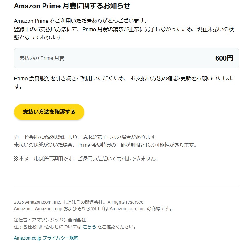 『登録中のお支払い方法にて、Prime 月费の請求が正常に完了しなかったため、 現在未払いの状態となっております。