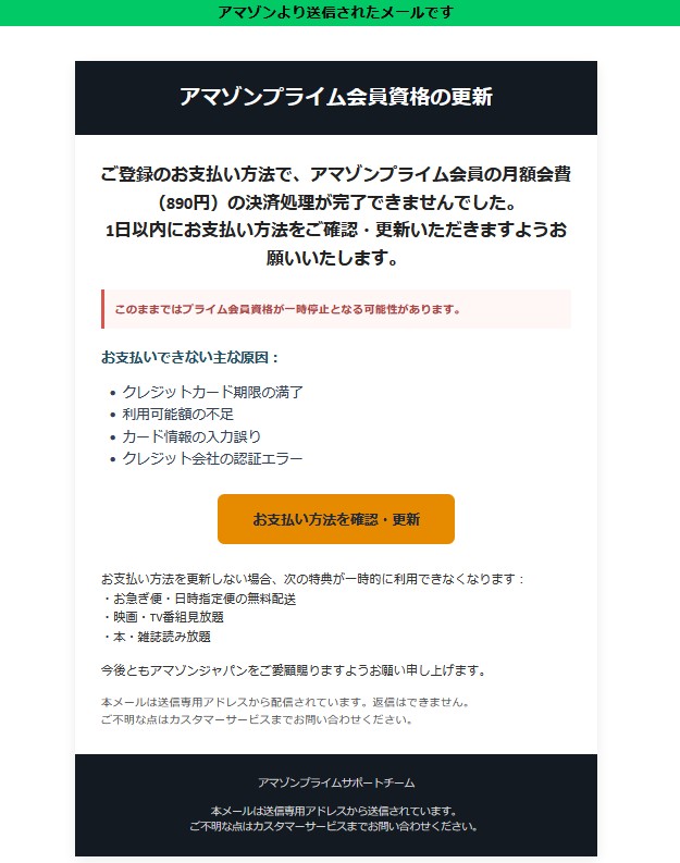 『ご登録のお支払い方法で、アマゾンプライム会員の月額会費(890円)の決済処理が完了できませんでした。』