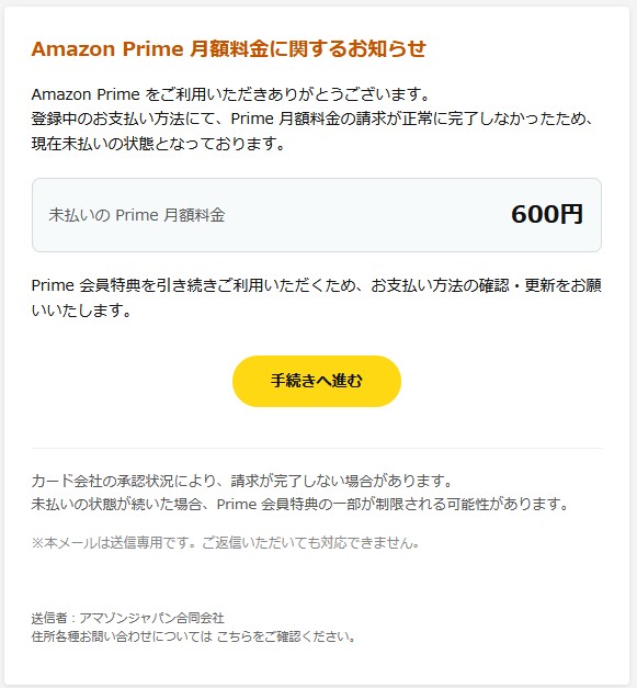 『登録中のお支払い方法にて、Prime 月額料金の請求が正常に完了しなかったため、現在未払いの状態となっております。』