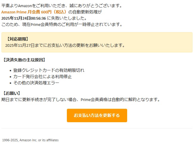 「Amazon Prime 月会費 600円(税込)の自動更新処理が2025年11月24日00:56:36 に失敗いたしました。」