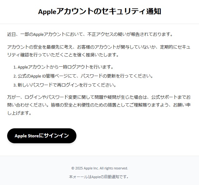 『近日、一部のAppleアカウントにおいて、不正アクセスの疑いが報告されております。』