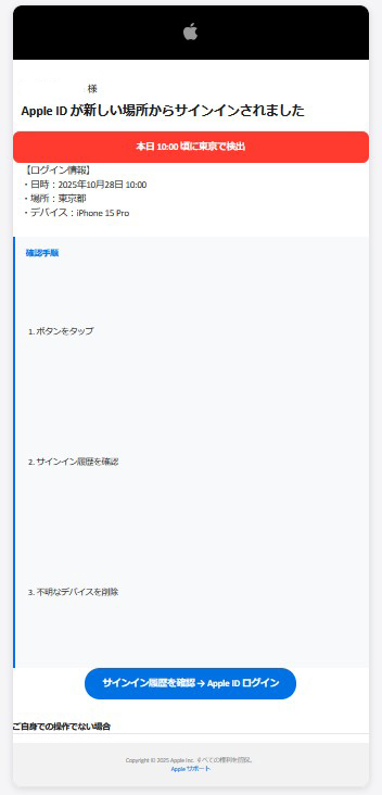 今回は”アップル(Apple)”を語る詐欺メールです。