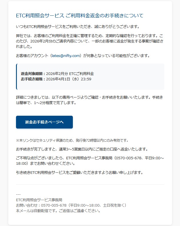 今回は”ETC利⽤照会サービス”を語る詐欺メールです。
