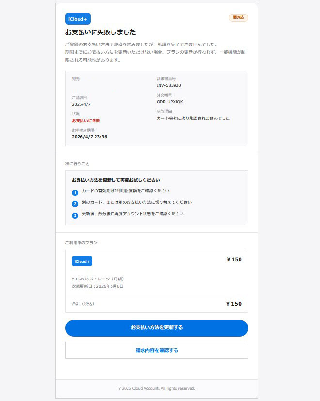 『ご登録のお支払い方法で決済を試みましたが、処理を完了できませんでした。』