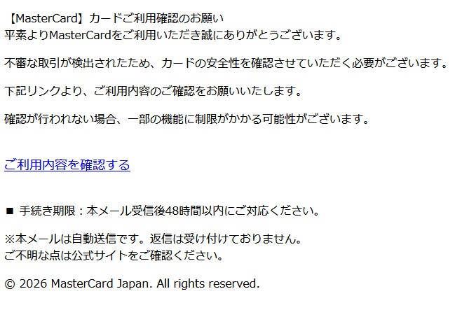 今回は”マスターカード”を語る詐欺メールです。