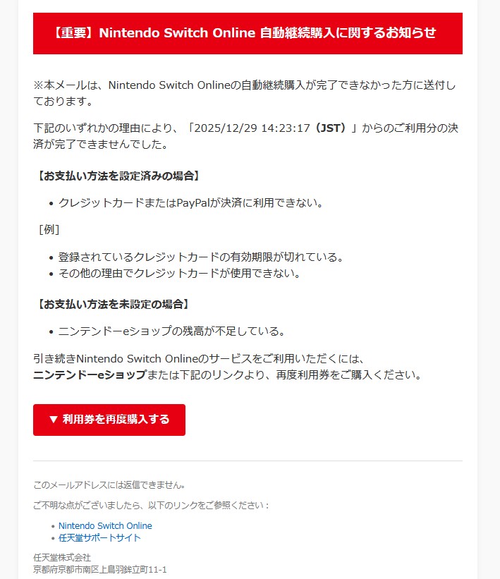『※本メールは、Nintendo Switch Onlineの自動継続購入が完了できなかった方に送付をしております。』