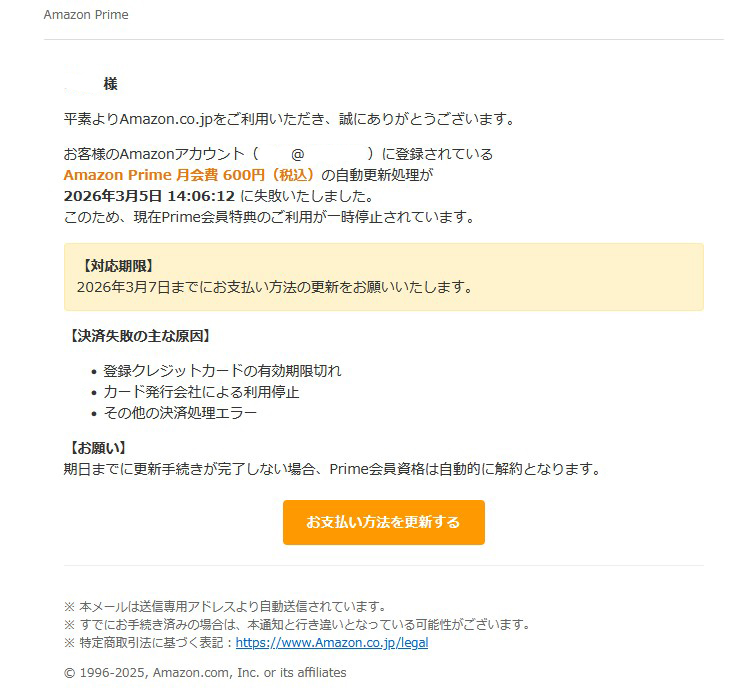 お客様のAm​az​onアカウント(◆◆◆@〇〇〇.com)に登録されているAm​az​on Pr​ime 月会費 600円(税込)の自動更新処理が2026年3月5日 14:06:12 に失敗いたしました。
