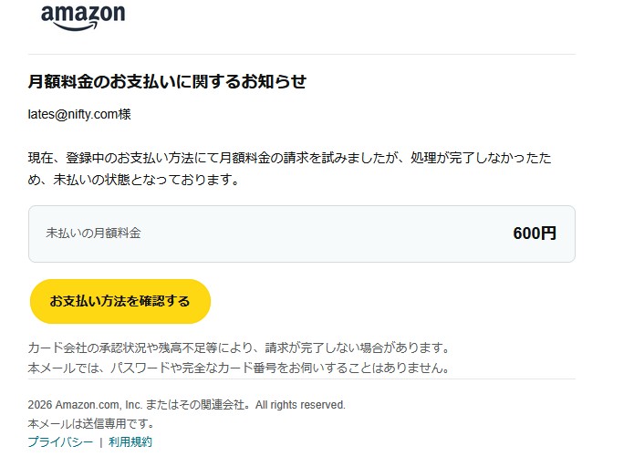 『現在、登録中のお支払い方法にて月額料金の請求を試みましたが、処理が完了しなかったため、未払いの状態となっております。』