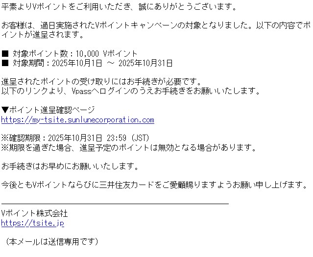 「お客様は、過日実施されたVポイントキャンペーンの対象となりました。以下の内容でポイントが進呈されます。