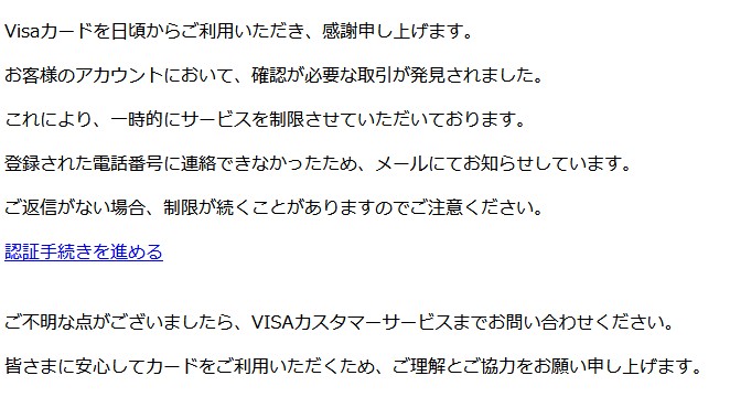 今回は”VISAカード”を騙る詐欺メールです。