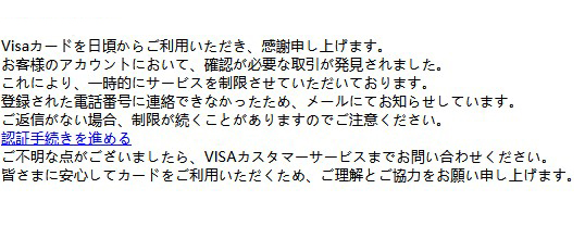 今回は”VISAカード”を騙る詐欺メールです。